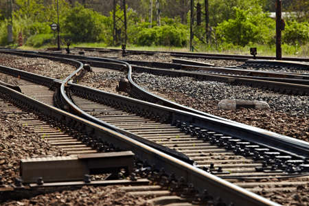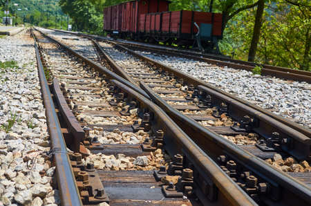 Railway. Railroad tracks. Railway tracks in a sunny day, close-up view. Switch on train tracks. Old railway view.