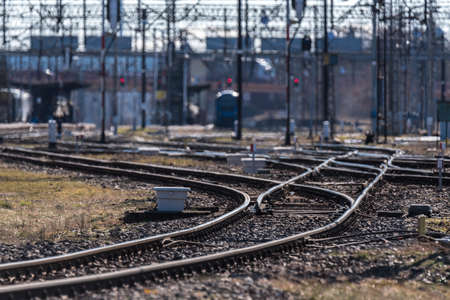 Multiple railroad tracks with junctions at a railway station in a perspective view