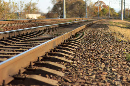 Rails at the electrified railway corridor. Concept railway, transportation, travel.
