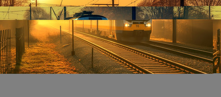 A golden sunset bathes the railroad tracks in warm light, with a train passing through a verdant landscape