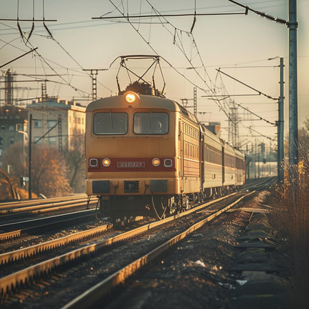 A sleek modern passenger train travels along scenic railway tracks, surrounded by lush landscapes and vibrant skies, symbolizing efficiency and connectivity in travel.