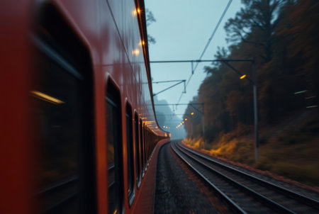 A dramatic evening shot capturing a moving train with dynamic light trails, conveying motion and the passage of time