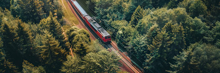 Aerial landscape of railroad tracks with train traveling in mountain valley panoramic banner.