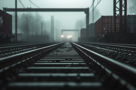 Misty Railway Tracks with Approaching Train in Foggy Industrial Setting.