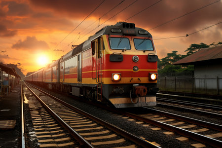 A large passenger train is heading in the direction of dawn. Place for text, concept, travel.