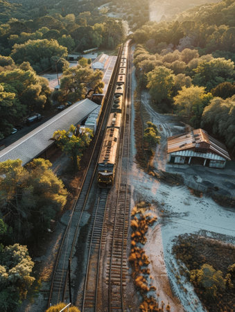 A serene view of railway tracks stretching into the sunset, surrounded by nature. Perfect for themes of travel, solitude, and exploration in tranquil landscapes.