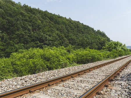An empty train track cutting through a Chinese forest, leaving ample copy space in the surroundings.