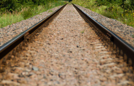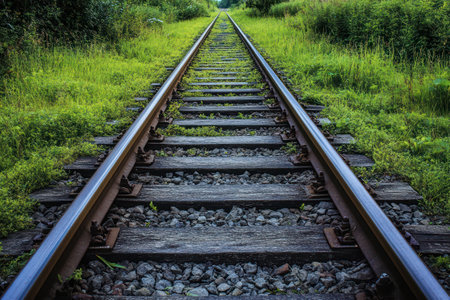 Straight train track stretches into distance through green grass and rural landscape, symbolizing journey, transport, and progress.