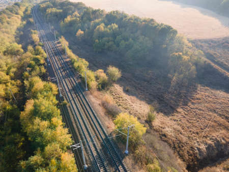 Aerial view railroad in autumn forest in foggy sunrise. Top view rural railway