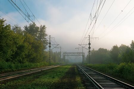 The railway runs through the autumn forest. The rays of the morning sun cut through the fog.