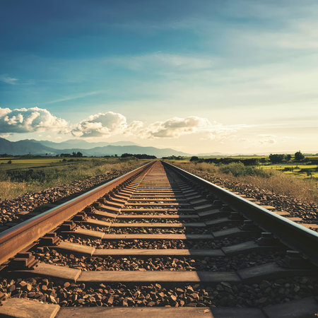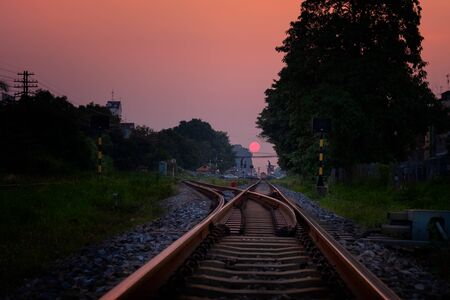Railway tracks from one city to another in Thailand in the evening of the sunset.