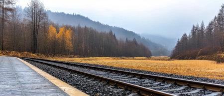 This captivating image features a tranquil railway track disappearing into the distance, flanked by vibrant autumn trees and set beneath a dramatic, cloud-filled sky, evoking a sense of journey and adventure. AI generated image