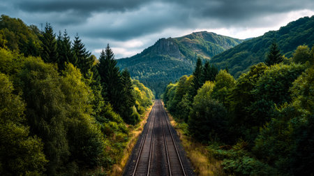 A winding railway means through vibrant, forested mountains beneath a moody, overcast sky, evoking tranquility and the allure of untouched nature.