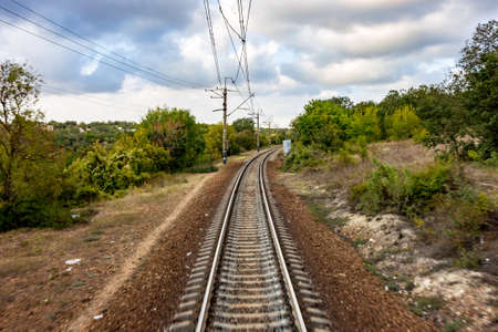 Rails at the electrified railway corridor. Concept railway, transportation, travel.