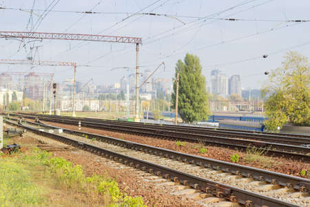 View of railway tracks on the background of the station. The concept of railway transport.