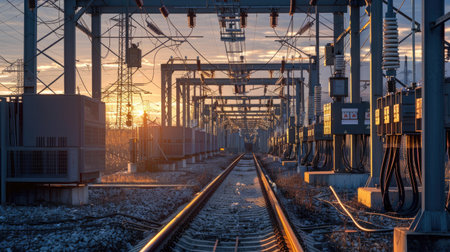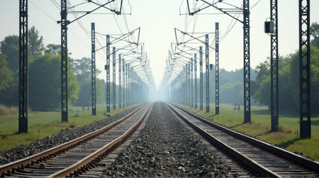 Journey into the distance on a mesmerizing train track perspective with overhead wires