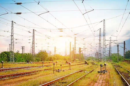 Rails at the electrified railway corridor. Concept railway, transportation, travel.