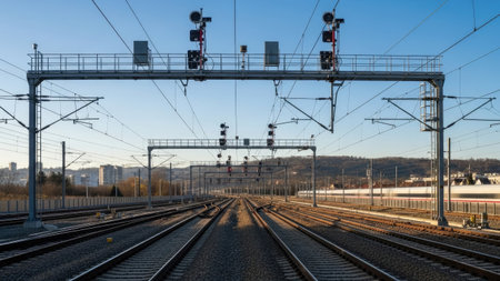 Railway tracks stretch towards the horizon under a bright, cloudless sky. Overhead power lines and signaling equipment are visible. The scene features a symmetrical composition with parallel lines. This image might be suitable for illustrating transportation, infrastructure, or related commercial projects.