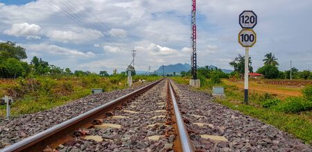 Perspective view of the length the railway track at Donmung Station,Bangkok,Thailand. Safety transportation,Avoid traffic jam and reduce green house effect. Saving energy and fuel