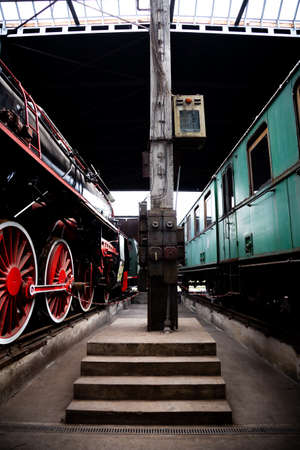 A steam locomotive and old passenger carriages standing in the building of the historic locomotive shed. The shot was taken in natural lighting conditions.