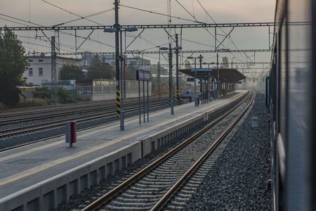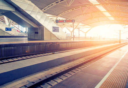 platform of train station and rails in the city. high quality photo
