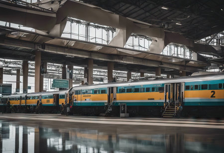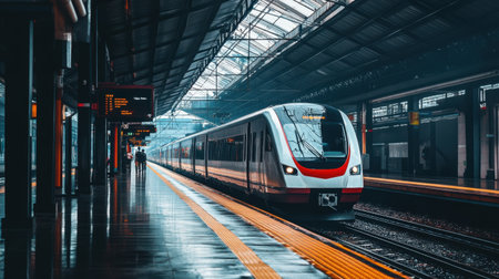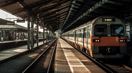 A train passing through a railway station. AI generated illustration