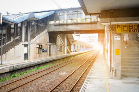 vintage train platform, railway station, building for crossing railroad tracks with sunset background, Taiwan