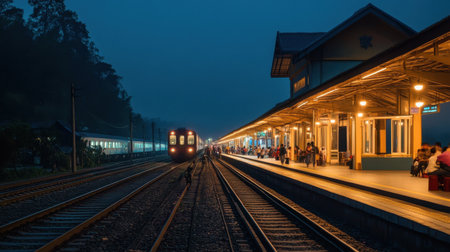 A tranquil railway station in Lao, China, beautifully illuminated at night. Trains wait as passengers gather on the platform, creating a serene atmosphere.