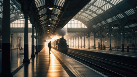 A person stands on a platform, watching a locomotive emerge. The scene is illuminated by sunlight. Dark shadows and architectural details create a sense of depth. This image can be suitable for various uses, including travel, transportation, and historical themed projects.
