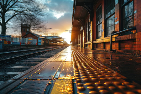 Scenic Cityscape Panorama of Historic Railway Station with Tracks Reflecting Serene Dusk Ambiance