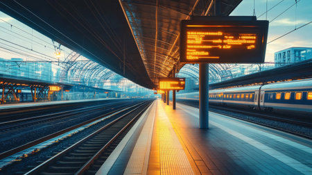A serene train station platform captured at dawn, showcasing electronic timetable displays. The tranquil atmosphere invites travelers to experience urban transport.