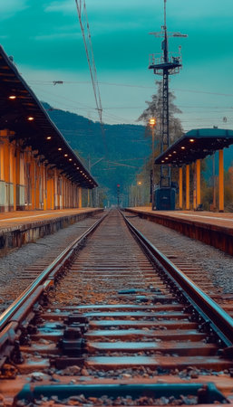 Quiet scene of a train station at dusk featuring curved tracks and industrial architecture, showcasing the beauty of transportation and urban design.