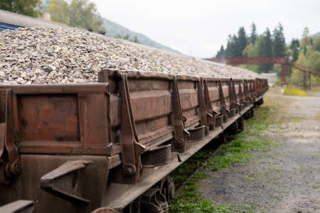 Close-up of a freight train wagon carrying rubble. copyspace.