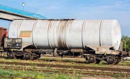 Abandoned rusty railway containers for as and oil transportation. Abstract train transport. Vintage style.