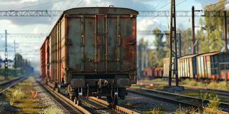 unclaimed rusty freight wagons derailed or on abandoned branches. wartime, crisis, misfortune, disaster. environment and insurance concept.Generative AI