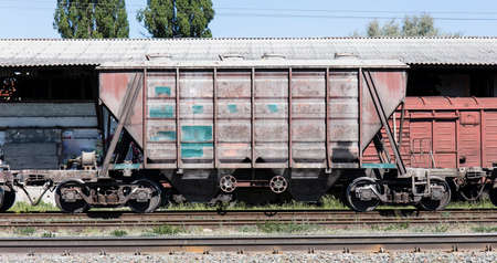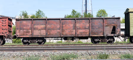 Old rusty rolling stock, freight cars on tracks. Train wheels close up. Concept, freight.