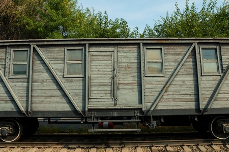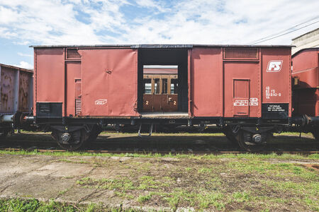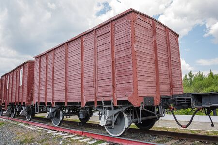 Old train carriage on rails, Red wooden train carriage