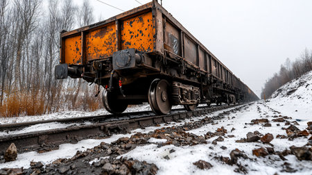 A low-angle shot of a weathered orange train car on snowy tracks, with bare trees in the background, creating a stark, industrial landscape on a cold, overcast day.