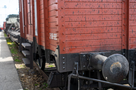 Old train carriage on rails, Red wooden train carriage. Old style hook railway coupling and buffers for linking freight train wagons.