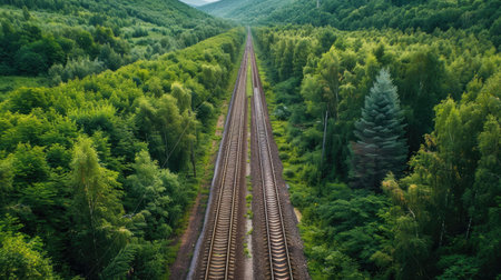 Beautiful landscape of railroad tracks running through a picturesque green forest, showcasing the harmony between man-made infrastructure and nature