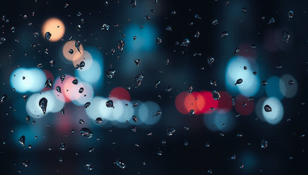 Raindrops on a glass window with a backdrop of city lights creating a bokeh effect on a dark, rainy night.
