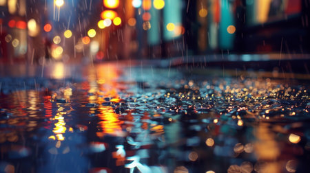 Rain drops on the wet asphalt with colorful bokeh background.
