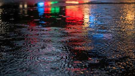 Reflections of city lights shimmering on the surface of a rain-soaked nighttime road