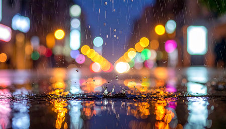 A vibrant cityscape scene during a heavy rainstorm with reflections and blurred lights.