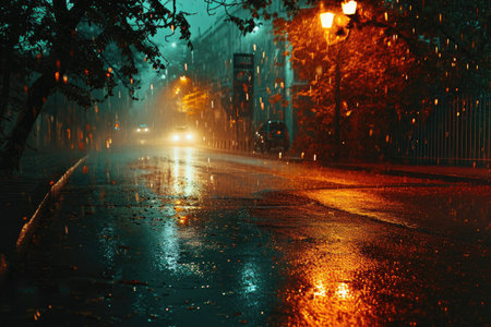 A nighttime scene depicts a rain-soaked urban environment. Illuminated streetlights cast a warm glow, reflecting off the wet pavement. Buildings and structures are visible in the background. The image has potential for various uses, including editorial and commercial projects.