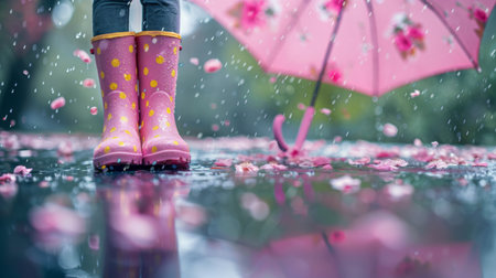 Child's Pink Rain Boots and Umbrella on a Rainy Day with Flower Petals.