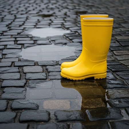 A vibrant pair of yellow boots stands in a rain puddle, reflecting the bright color against a rainy urban backdrop. Ideal for fashion and lifestyle themes.
