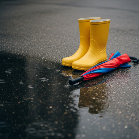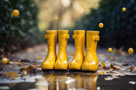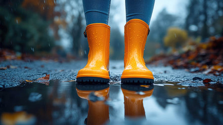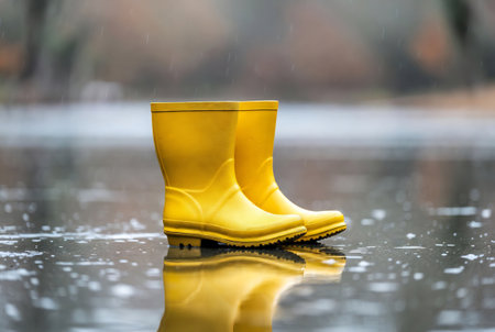 A pair of bright yellow boots stands in a rainy puddle, surrounded by a moody outdoor setting. Perfect for depicting playful outdoor activities in wet weather.