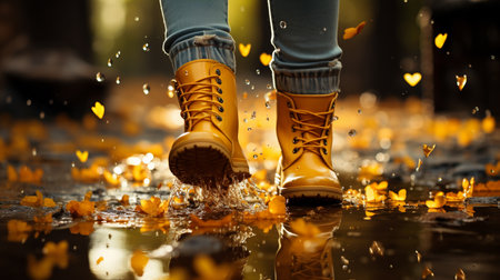 A person in yellow rain boots splashing in a puddle. AI generative image.