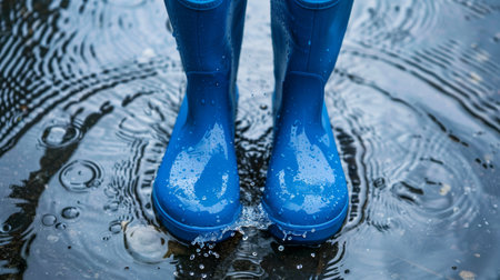Blue rain boots in water puddle, ripples, reflection ai generated